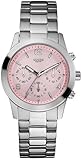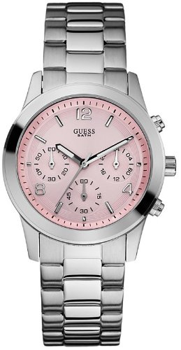 Contemporary, feminine style by GUESS. This watch features a silvertone mixed metal bracelet and round case. Pink chronograpu dial with silvertone stick indices, logo, date window and three subdials. Quartz movement. Water resistant to 100 meters.- GUESS Feminine Contemporary Watch
