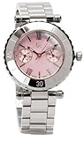 Swiss Multifunction Movement. Roman numerals. Polished stainless steel coin-edge bezel. Two subdials for day of week and day. Stainless steel case. Pink dial. Two hidden selector buttons. 100 meters/330 feet water resistant.