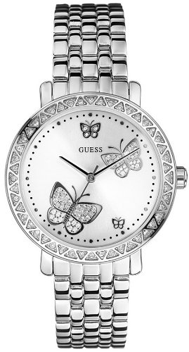 Silver tone stainless steel band Round silver dial with silver tone casing encrusted with crystals around the edge Crystal embellished butterflies on face Crystallized by Swarovski Clasp closure Self-adjustable links Water resistant- GUESS Stainless Steel Bracelet Watch